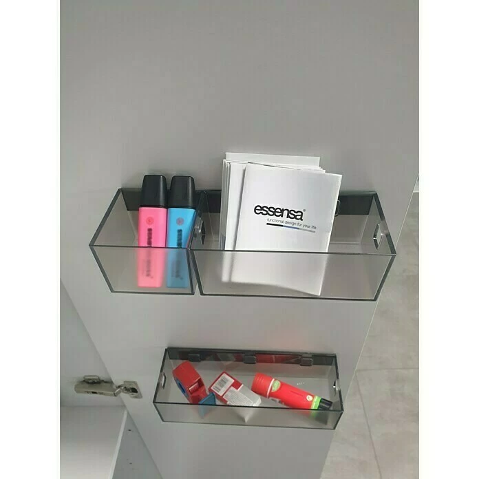 Das essensa Aufbewahrungsbox-Set Boxx ist ein System aus drei unterschiedlich großen Behältnissen mit vielfältigen Einsatzmöglichkeiten produziert in Deutschland. Das Set besteht aus drei Aufbewahrungsboxen in den Größen klein, mittel und groß. Die Boxen können mit den beiliegenden Befestigungsleisten und den Verbindungsclips frei kombiniert werden. So können die Behälter an Tür-Innenseiten der Küche oder Hauswirtschaftsschränke befestigt werden. Auch in Schubladen lässt sich mit den Boxen einfach Ordnung halten. Oder die Behälter werden einfach mit der Befestigungsleiste an der Wand befestigt oder freistehend in Küchenschränken oder auf die Arbeitsplatte gestellt. Die Befestigungsleiste wird hierbei mit Schrauben befestigt und die Boxen aufgesteckt, die Verbindung der Module untereinander erfolgt mit Verbindungsclips. Die kompakte Bauweise ermöglicht eine einfache Reinigung unter laufendem Wasser mit etwas Spülmittel. Die Abmessungen der kleinen Box betragen 8,4 x 8,4 x 6,4 cm (BxHxT), die Abmessungen der mittleren Box betragen 16,8 x 8,4 cm x 6,4 cm (BxHxT) und die Abmessungen der großen Box betragen 25,2 x 8,4 x 6,4 cm (BxHxT).