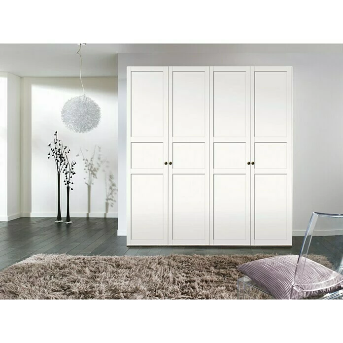 Der Kleiderschrank Brooklyn von Express Möbel verfügt über vier Drehtüren. Der im Landhausstil designte Schrank ist in einer stiltypischen Kassetten-Optik gehalten und mit zierlichen, antik-silbernen Knopfgriffen ausgestattet. Die Drehtüren lassen sich darüber hinaus mithilfe der Soft-Close Funktion geräuscharm schließen. Im Schrank befinden sich drei obere Ablagefächer zum Verstauen von Decken, Haushaltsartikeln oder Ähnlichem. Drei Kleiderstangen eignen sich zur knitterfreien Aufbewahrung von Kleidungsstücken. Die Kleiderschränke von Express Möbel sind aus Holzwerkstoffen gefertigt. Die Lieferung kann bis zum gewünschten Platz nach Hause geliefert werden, ganz ohne Aufpreis.