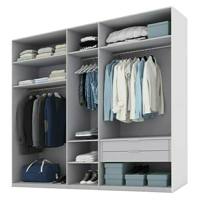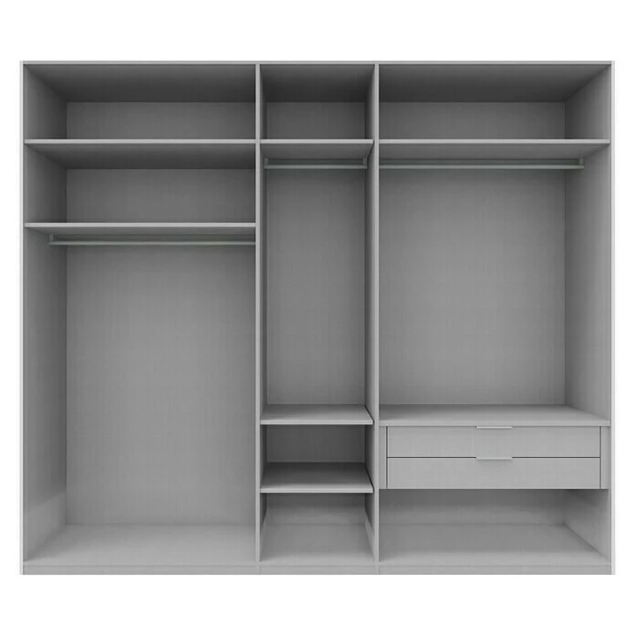 Der Kleiderschrank Swift von Express Möbel ist ein moderner Drehtürschrank, der in unterschiedlichen innen Ausstattungen, Dekoren, mit Spiegeln oder Glasfronten erhältlich ist. In den oberen Ablagefächern können Decken, Hüte oder Ähnliches sicher verstaut werden. Die Kleiderstangen eignen sich zur knitterfreien Aufbewahrung der Kleidungsstücke. Der aufgeteilte Innenbereich wird von den Türen verdeckt. Die Drehtüren mit alufarbenen Griffen und Dekorbeschichtung sind mit einer Soft-Close-Funktion ausgestattet, die für geräuscharmes und sanftes Schließen sorgt. Der Swift ist aus Holzwerkstoff gefertigt und verfügt über hochwertige Metallbeschläge. Er ist wiederaufbaubar und somit umzugstauglich.