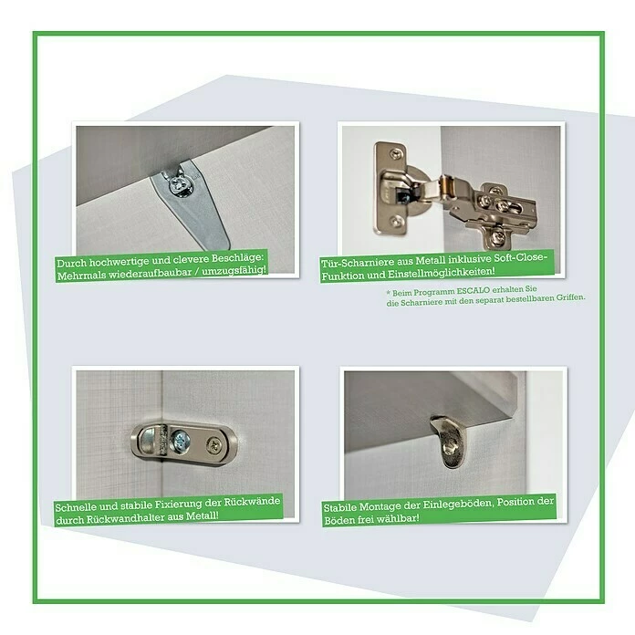 Mit dem modularen Schrank-Programm ESCALO von Express Möbel kreieren Sie im Handumdrehen Ihre persönliche, multi-variable Aufbewahrungslösung für jede Raumsituation. Durch die Auswahl aus vier verschiedene Elementhöhen und zwei Elementtiefen statten Sie auch niedrige Raumhöhen, Dachschrägen oder schmale Durchgänge ideal mit Stauraum aus. Durch die Kombination einzelner, freistehender Schrankelemente bleiben Sie langfristig flexibel, in dem Sie jederzeit Ihre Schrankkonfiguration verkürzen, verlängern oder aufteilen können. Den Innenraum des Schrankes gestalten Sie mit dem zusätzlich erhältlichen Zubehör ganz nach Ihren Wünschen. Hierdurch schaffen Sie sich Ihre ganz persönliche Lösung für Home Office, Garderobe, Haushalts- oder Vorratsraum oder Garage. Lassen Sie sich hier von unseren Konfigurationsbeispielen in den Produktbildern inspirieren! Kombinieren Sie die Schrankelemente mit der gewünschten Drehtüren aus ESCALO, indem Sie ganz einfach die gewünschte Tür passend zur Elementhöhe auswählen und den passenden Griff dazu kombinieren. Mit dem passenden Griff erhalten Sie die für die Elementhöhe erforderlichen Topfband-Scharniere aus hochwertigem Metall mit Soft-Close-Funktion zur Montage der Drehtür. Der Türanschlag ist hier übrigens frei wähl- und wechselbar, damit Sie auch in Zukunft dieses Möbel auf neue Anforderungen anpassen können. Damit Sie und auch Ihre Umwelt sich lange mit diesen Möbelstücken wohlfühlen, wurden alle Möbelstücke klimaneutral aus FSC®- und PEFC-zertifizierten Holzwerkstoffe und ausschließlich Made in Germany produziert! Zur Montage einer Drehtür bitte den zur Höhe passenden Griff aus dem Programm ESCALO mitbestellen. Nur mit diesem Griff erhalten Sie auch die zur Türmontage notwendigen Topfband-Scharniere in der jeweils benötigten Anzahl. Separat erhältliches Zubehör muss passend zur Tiefe des Schranklementes bestellt werden. Bitte sichern Sie die einzelnen Schrankelemente mit der im Lieferumfang enthaltenen Kippsicherung.