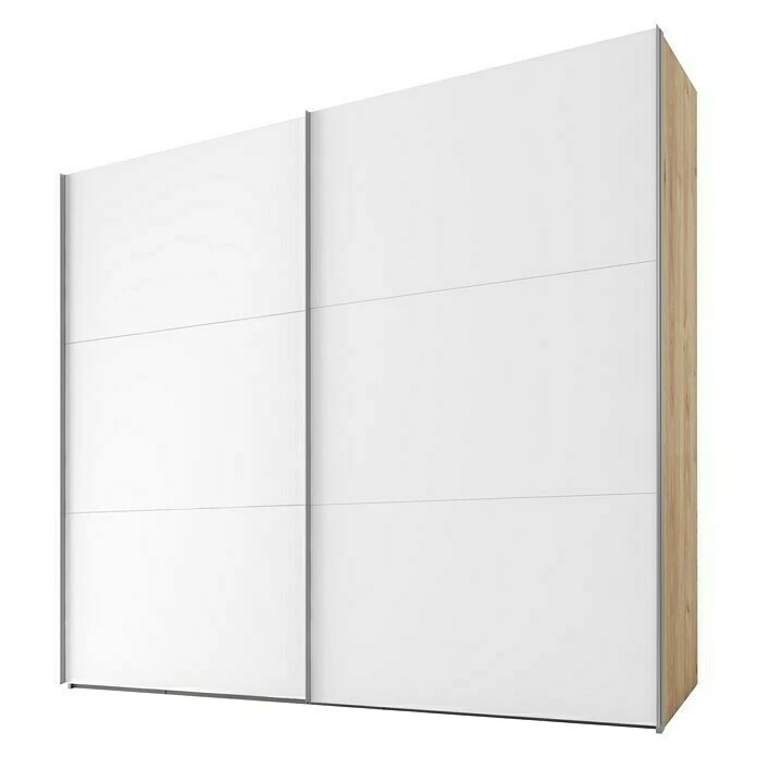 Der Kleiderschrank Swift von Express Möbel ist ein moderner Schwebetürenschrank mit einem frei zu nutzendem Innenraum. In den oberen Ablagefächern können Decken, Hüte oder Ähnliches sicher verstaut werden. Die Kleiderstangen eignen sich zur knitterfreien Aufbewahrung der Kleidungsstücke. Der aufgeteilte Innenbereich wird durch die Türen verdeckt. Die Schwebetüren sind mit einem Staubschutz ausgestattet, welcher das Verstauben des Innenbereichs verhindert. Der Swift ist aus Holzwerkstoff gefertigt und verfügt über hochwertige Metallbeschläge. Er ist wiederaufbaubar und somit umzugstauglich.