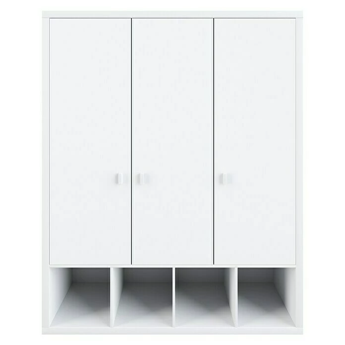 Der Kleiderschrank Caro von Phönix bietet großzügigen Stauraum für Ihre Kleidung oder Schuhe. Der dreitürige Schrank ist mit einer Kleiderstange ausgestattet, die sich über die Breite von zwei Türen erstreckt. Über dieser befindet sich ein geräumiges Fach. Hinter der dritten Tür verbergen sich vier großzügige Fächer, auf denen Sie gefaltete Kleidung unterbringen können. Als besondere Hingucker fungieren die vier Fächer am Fuße des Schrankes, die entweder als offene Fächer verwendet oder durch verschiedene Einsätze wie Schubladencontainer, Türen oder Kisten erweitert werden können.