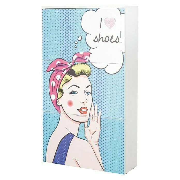 Der Schuhschrank Pixa von Phönix ist nicht nur ein geräumiger Schuhschrank, sondern durch seinen Pop-Art-Aufdruck auch ein echter Hingucker. Die drei Fächer, die über die silbernen Griffe bequem zu öffnen sind, bieten ausreichend Platz für bis zu 12 Paar Schuhen. Die unauffälligen Griffe stören dabei nicht die Optik und fügen sich diskret in den Aufdruck ein. Der Schuhschrank hat eine sehr geringe Grundfläche und bietet somit auf kleiner Stellfläche viel Stauraum.