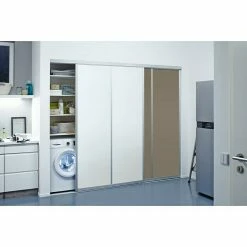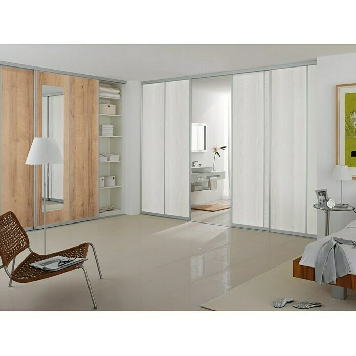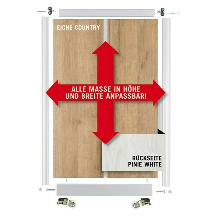 Mit dem Room Plaza Easy Schiebetür-Bau-Set lassen sich sowohl begehbare Schränke oder Raumteiler anfertigen, als auch Nischen und Ecken abtrennen. Die stabilen Alu-Schiebetüren in hochwertiger Verarbeitung lösen sogar schwierige Raumverhältnisse durch kostengünstigen Selbstbau. Dieses Schiebetürsystem beinhaltet zwei unterschiedliche Dekore – wahlweise Eiche Country oder Pinie White. Das passende Room Plaza Easy Schienen-Bau-Set ist nicht im Lieferumfang enthalten und muss separat erworben werden. Auf Maß gefertigte Room Plaza Raum- und Ausbausysteme sind exklusiv im BAUHAUS Fachcentrum bestellbar.