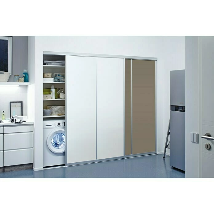 Mit dem Room Plaza Easy Schiebetür-Bau-Set lassen sich sowohl begehbare Schränke oder Raumteiler anfertigen, als auch Nischen und Ecken abtrennen. Die stabilen Alu-Schiebetüren in hochwertiger Verarbeitung lösen sogar schwierige Raumverhältnisse durch kostengünstigen Selbstbau. Dieses Schiebetürsystem beinhaltet zwei unterschiedliche Dekore – wahlweise Taupe oder Weiß Miniperl. Das passende Room Plaza Easy Schienen-Bau-Set ist nicht im Lieferumfang enthalten und muss separat erworben werden. Auf Maß gefertigte Room Plaza Raum- und Ausbausysteme sind exklusiv im BAUHAUS Fachcentrum bestellbar.