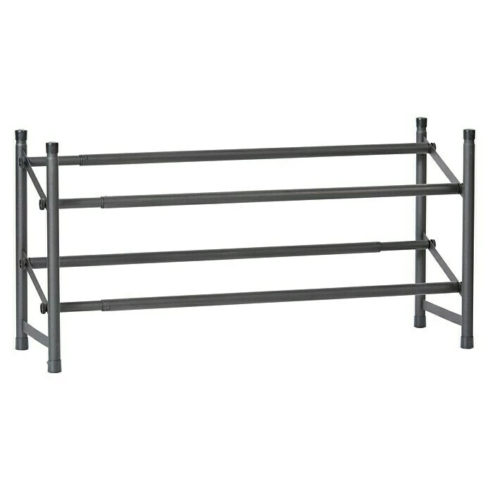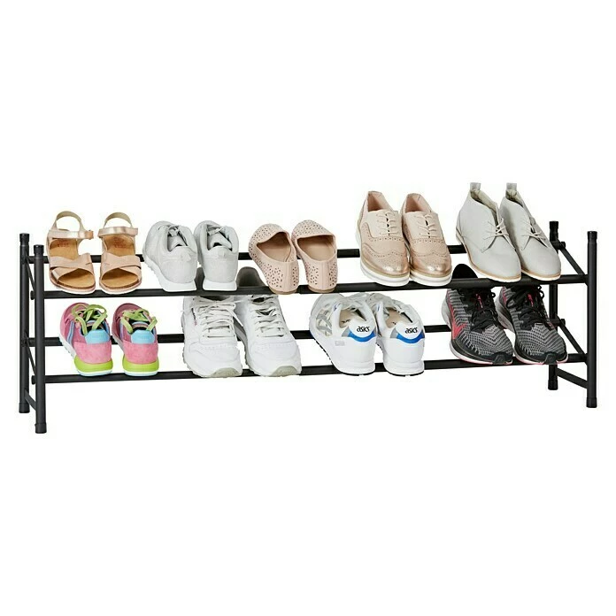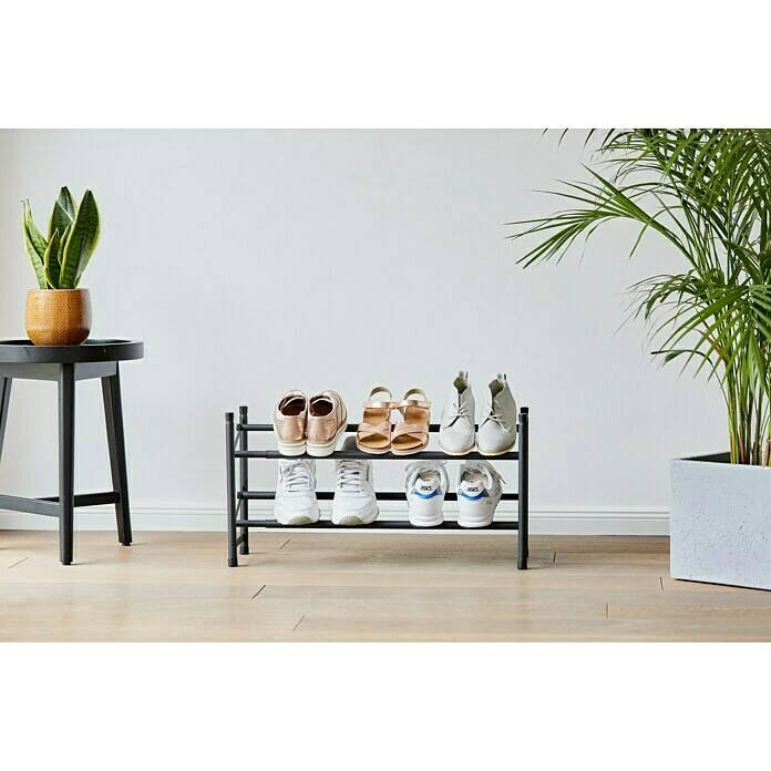 Dieses freistehende Schuhregal bietet auf seinen zwei Ablagen Platz für bis zu 10 Paar Schuhe. Dank der verstellbaren Breite lässt es sich an den zur Verfügung stehenden Platz anpassen. Es ist schwarz, praktisch und einfach zu installieren. Es ist möglich, 2 Regale übereinander zu stapeln, um den Stauraum zu vergrößern.